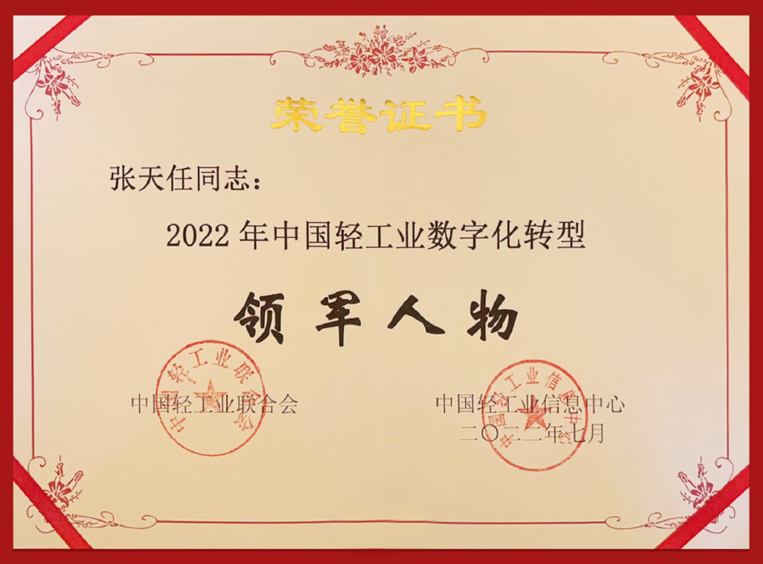 ● 7月27日,在第十二届中国轻工业信息化大会上,710公海控股集团获得“中国轻工业数字化转型先进单位”,张天任董事长获得“中国轻工业数字化转型领军人物”。